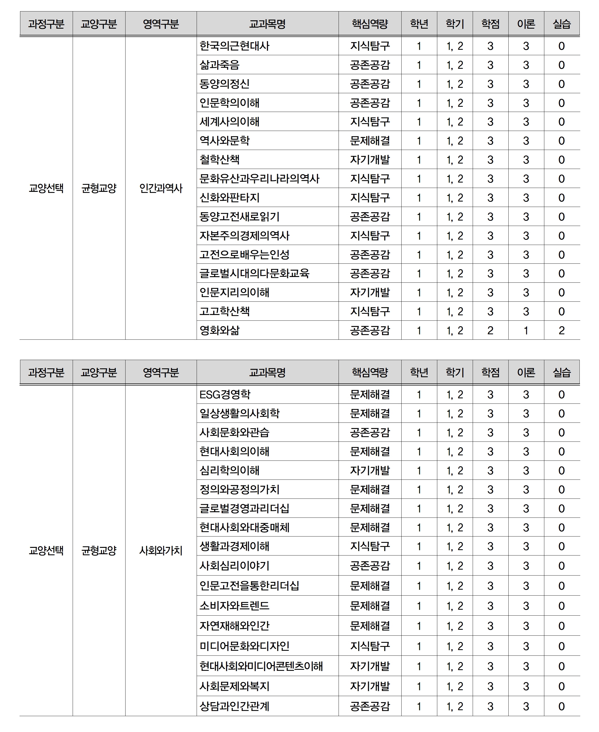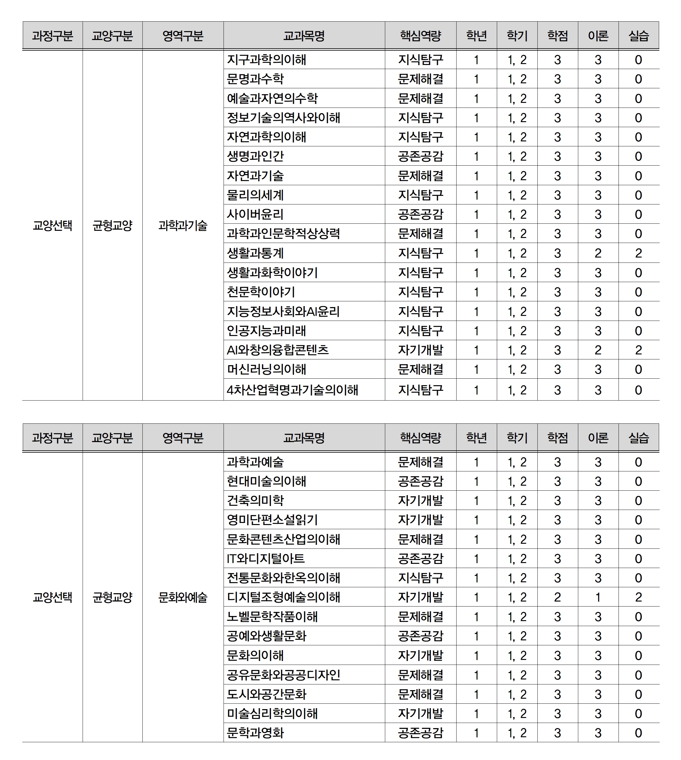 균형교양 영역별 각1개 교과목 이상 필수 이수하여야 함.